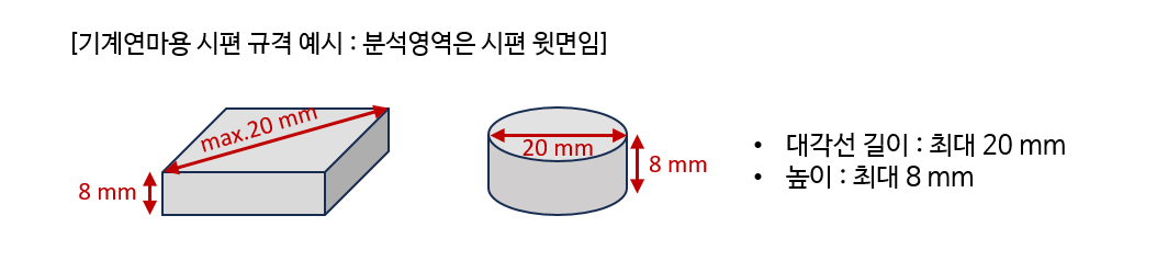 • 30mm 이상 마운팅 시편은 시편 위치에 따라 분석 영역 제한이 있을 수 있으며 별도 협의 필요
